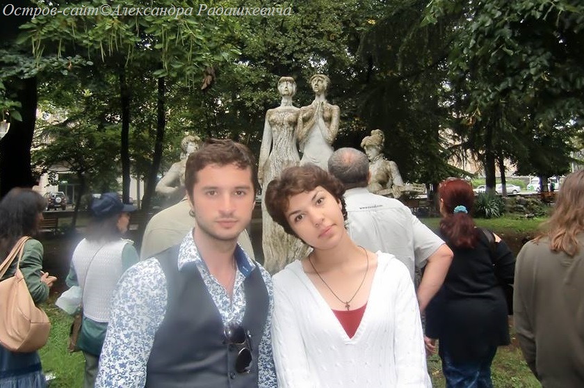 Лаша Чургулия и Нина Цитланадзе, ангелы-хранители фестиваля, на фоне памятника сестрам Ишхнели.