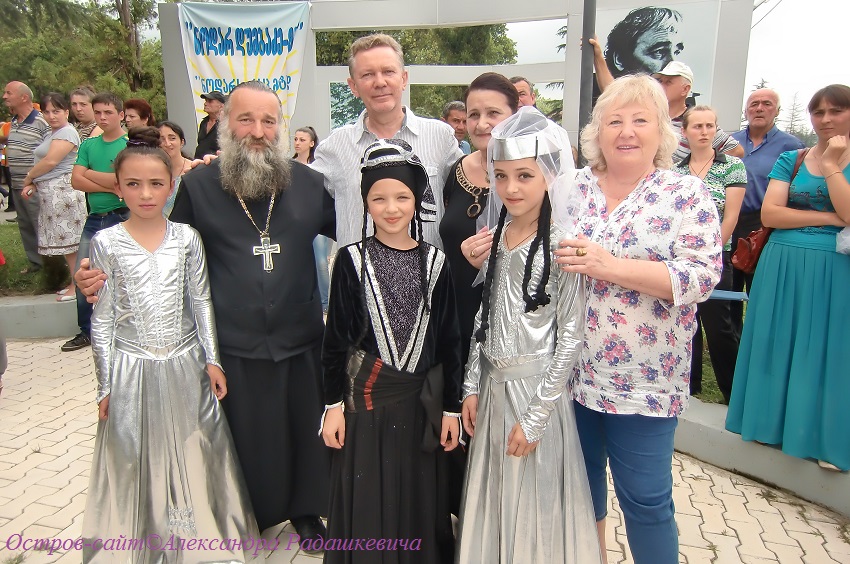 Лаша Чургулия и Нина Цитланадзе, ангелы-хранители фестиваля, на фоне памятника сестрам Ишхнели.